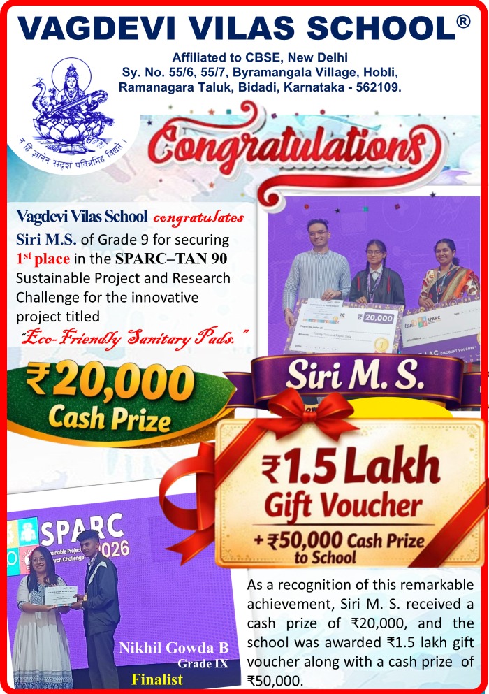 VAGDEVI VILAS SCHOOL, Bidadi, is a pivotal institution of ‘Sundaramma Krishnamurthy Educational and Charitable Trust’. The School is located in a lush green environment amidst all the modern amenities. The school has earned accolades for its excellent educational and extra curricular milieus and tops the list as one of the best schools in this region. The school provides various amenities like Science Tech Park, a full-fledged R&D wing, Spacious and well equipped play area both indoor and outdoor, Digi Class and Audio Visual Room, a well stocked and resourceful library etc to name a few.